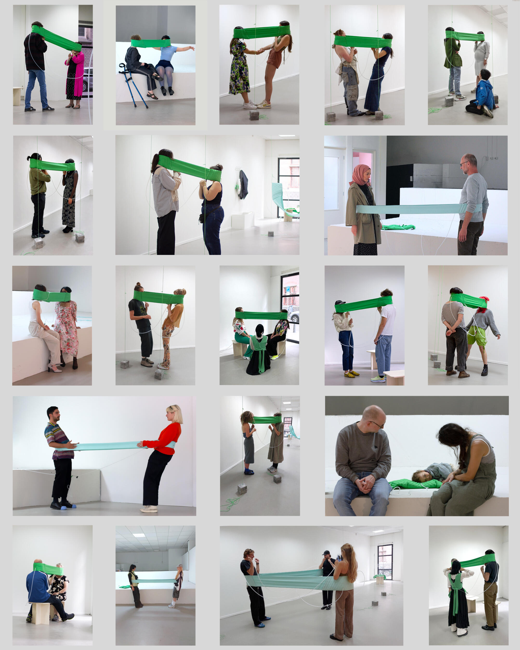 Performative objects (2023) – padded fabrics, air bags, tubes, air compressor.