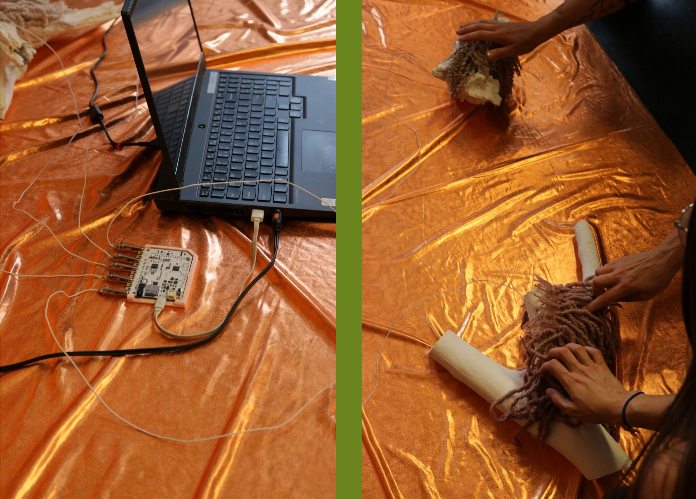 As we use words and names to relate to each other and things, having the words for each microscopic part of a moss builds an intimacy with the plant and speaks of careful observation (Kimmerer, 2003). Taking the architecture of mosses as a point of departure, the interplay with materials and techniques form a wordless intimacy with mossy otherness.Sumptuous soft looking repetitions crafted by hand invite participants to engage with an embodied occupation of time. Its textures branches from taxonomic descriptions and emerge from a combination of mimicry and an open-ended, exploratory process. The sounds are inspired by the evolutionary imperative of mosses to hold water. Electrified water affinity. Giving voices to the mute poetics of mosses. Its enchanting quality maps the audience map into the world with more attentiveness towards spell-binding other worldly mosses.